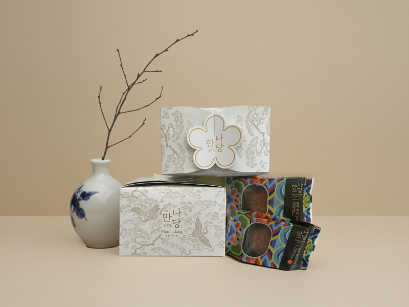 한국 전통 디저트 브랜드 ‘만나당’은 시그니처 상품인 궁중 약과와 유자 약과의 패키지에 대한제국 왕실의 상징인 오얏꽃 문양을 활용해 한국적이면서도 세련된 디자인을 담았다. 또한 면세점 외국인 고객 특성을 반영해 합리적인 가격대로 구성, 선물용 수요를 적극 반영했다.