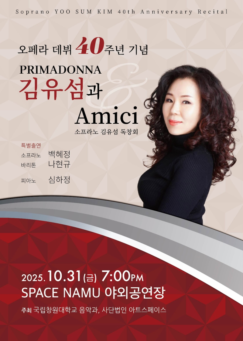 국립창원대학교 예술대학 학장이자 오페라 전문 가수로 활약 중인 소프라노 김유섬 교수가 '오페라 데뷔 40주년 프리마돈나 김유섬과 Amici'를 오는 31일 개최한다.