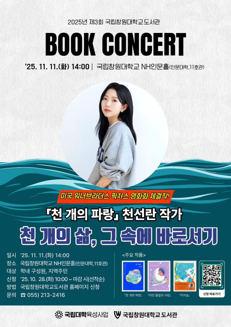 정연길 국립창원대 도서관장은 “이번 북콘서트는 천선란 작가의 SF 세계를 통해 미래와 인간, 기술과 감정의 경계를 탐구하고, 참가자들이 상상력과 사유의 폭을 넓히는 시간이 될 것이다. 도서관이 지역사회와 함께 다채로운 상상과 창의적 경험을 나누는 장으로서 역할을 이어가겠다”고 말했다.