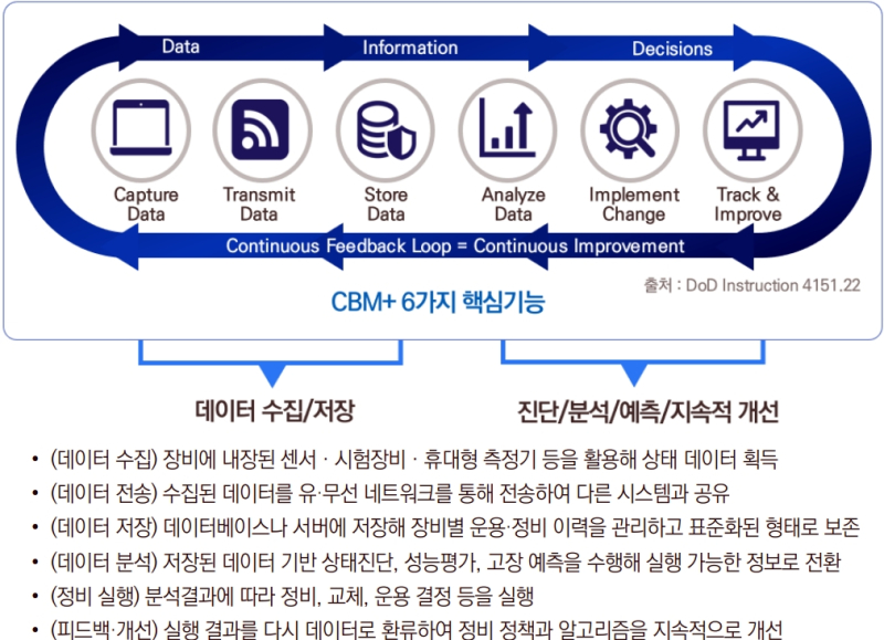CBM+는 핵심 기능인 데이터 수집·전송·저장·분석, 정비실행, 피드백·개선이 체계적으로 작동해야만 효과적인 운영이 가능하다.