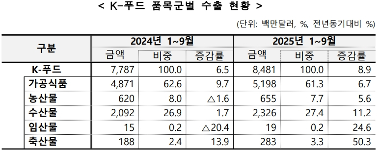 품목별로는 가공식품이 전년동기대비 6.7% 증가한 52억 달러를 기록하며 K-푸드 전체 수출액의 61.3%를 차지, 수출 증가를 견인했다.