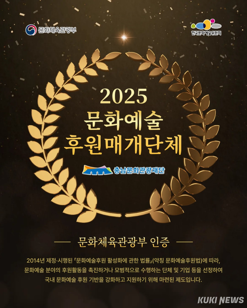 충남문화관광재단이 ‘2025년도 문화예술후원매개단체 인증제도’에서 신규 인증기관으로 선정되었다. 충남문화관광재단(대표이사 이기진)이 ‘2025년도 문화예술후원매개단체 인증제도’에서 신규 인증기관으로 선정되었다고 28일 밝혔다.