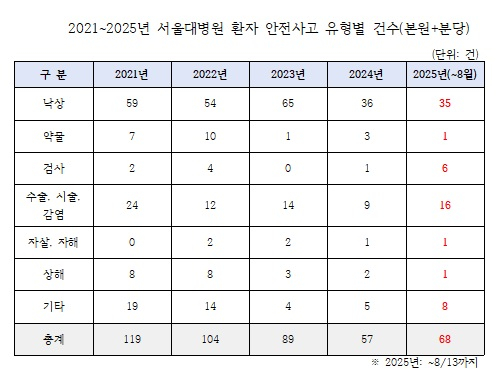 김민전 국민의힘 의원이 서울대병원으로부터 제출받은 국정감사 자료에 따르면, 서울대병원(본원+분당)에서 2021년부터 올해 8월까지 총 437건의 환자 안전사고가 발생했다. 연도별로는 △2021년 119건 △2022년 104건 △2023년 89건 △2024년 57건으로 감소 추세를 보이다가 올해 8월까지 68건이 발생하며 다시 증가세로 돌아섰다.