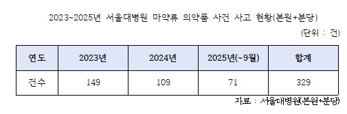 환자 안전사고뿐 아니라 마약류 의약품 관리에도 허점이 드러났다. 서울대병원에서 최근 3년간(2023~2025) 발생한 마약류 의약품 사고 건수는 총 329건에 달했다. 연도별로는 △2023년 149건 △2024년 109건 △올해 9월까지 71건이 발생했다.