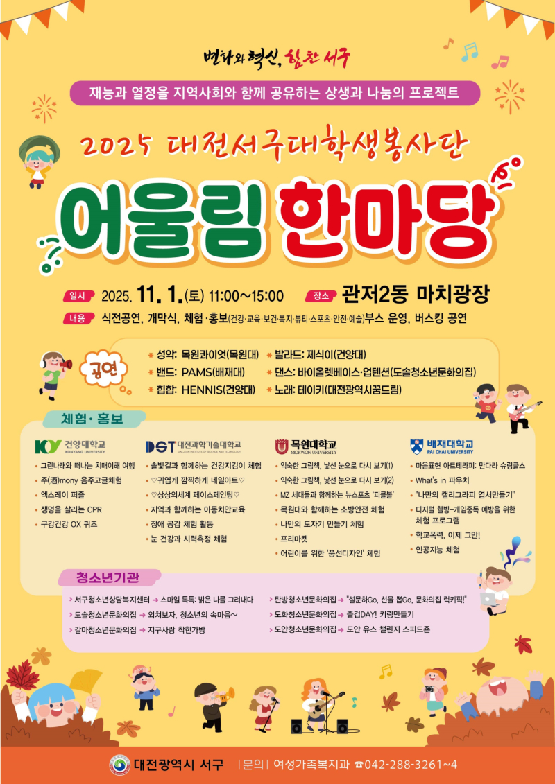 전 서구는 11월 1일 관저2동 마치광장에서 ‘대전서구대학생봉사단 어울림한마당’ 행사를 개최한다.
