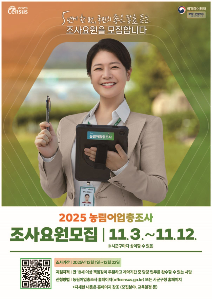 문경시는 '2025 농림어업총조사'를 위해 11월 3일부터 12일까지 열흘간 조사관리요원 12명, 조사원 80명 등 총 92명을 선발한다고 29일 밝혔다.
