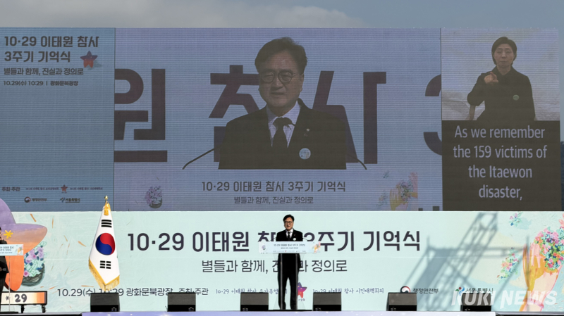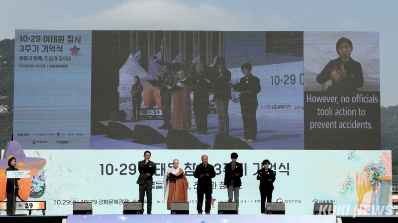 29일 서울 광화문 북측광장에서 열린 10·29 이태원 참사 3주기 기억식은 참사를 상징하는 시각인 오전 10시29분에 맞춰 서울 전역에 1분간 추모 사이렌이 울리며 시작됐다. 추모식에는 김민석 국무총리, 우원식 국회의장, 정당·종교계 인사와 시민단체 관계자, 시민 등 약 2000명이 참석했다.