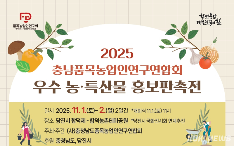 충남도 농업기술원은 다음달 1일부터 2일까지 당진시 합덕농촌테마공원에서 ‘충남 우수 농·특산물 홍보판촉전’을 개최한다고 29일 밝혔다.