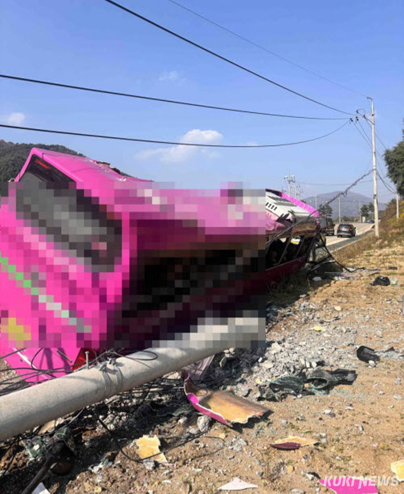 29일 강원 평창에서 28명을 태운 관광버스가 배수로에 빠지며 전봇대를 들이받았다.