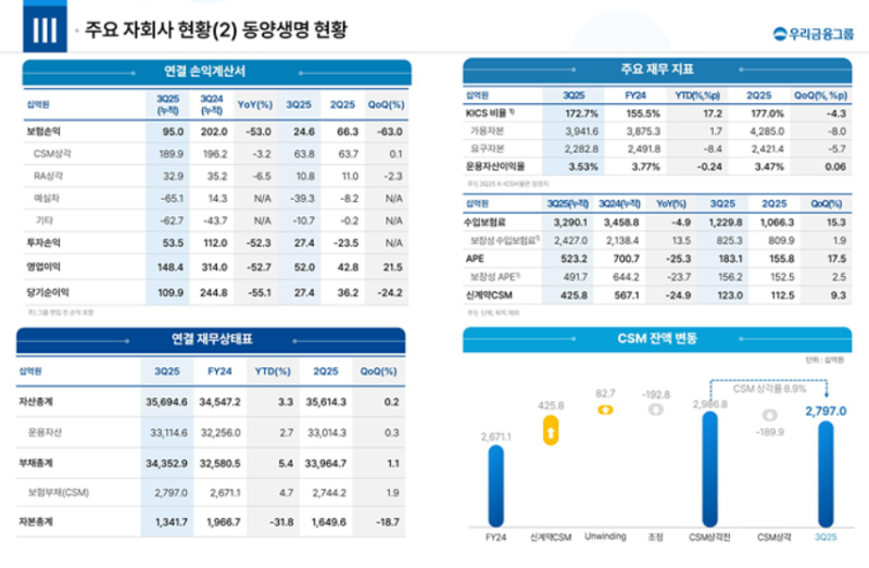우리금융그룹에 편입된 동양생명의 올해 3분기 순이익이 전년 대비 70% 가까이 줄었다.