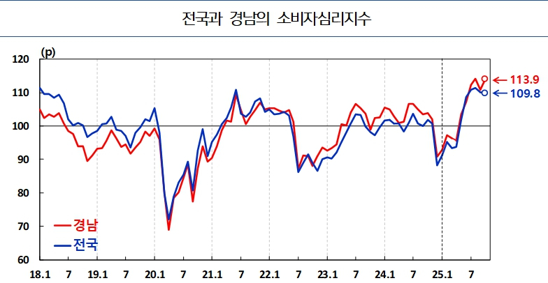 이번 상승은 2차 민생회복 소비쿠폰 지급과 지역 가을축제 성황 등으로 생활형편에 대한 인식이 개선된 영향으로 분석된다. 전국 소비자심리지수(109.8)는 오히려 0.3포인트 하락해 경남의 소비심리가 전국 평균을 웃돌았다.
