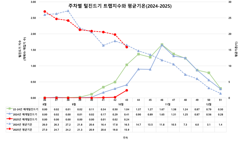 털진드기는 평균기온이 20℃ 미만일 때부터 발생이 증가하며, 10~15℃ 구간에서 가장 활발히 활동하다가 10℃ 미만으로 떨어지면 급감하는 특성을 보인다. 올해 43주차 평균기온은 15.9℃로, 털진드기 발생이 본격적으로 증가하는 시기다.