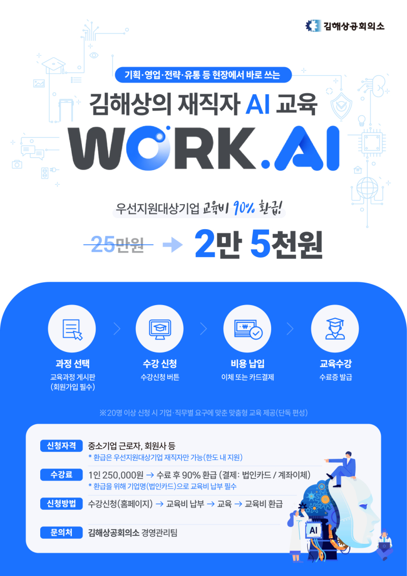 과정별 교육대상은 중소기업 재직자와 사업주다. 교육은 하루 전까지 김해상의 재직자 AI교육(WORK.AI) 누리집(바로가기)으로 신청하면 된다.