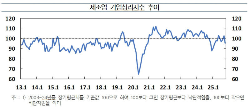 제조업 기업심리지수(CBSI)는 95.3으로 전월보다 7.4포인트 하락했고, 비제조업도 96.2로 4.6포인트 떨어졌다. 두 부문 모두 기준치(100)를 밑돌며 체감경기 악화를 반영했다.