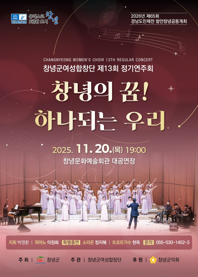 오는 11월20일 오후 7시 창녕문화예술회관 대공연장에서 ‘창녕의 꿈! 하나되는 우리’를 주제로 창녕군여성합창단 제13회 정기연주회를 개최한다.