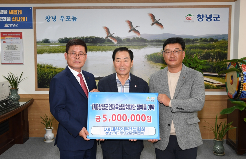 (사)대한전문건설협회 경남도회 김주생 회장과 창녕군운영위원회 장영준 운영위원장이 (재)창녕군인재육성장학재단에 지역 인재 육성을 위한 장학금 500만원을 기탁했다.