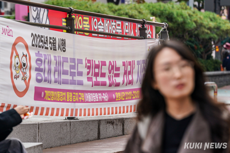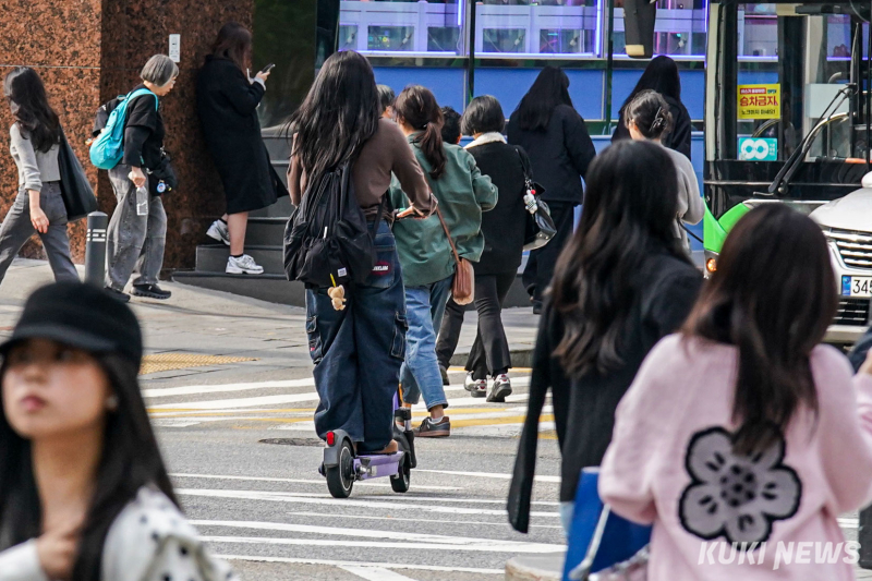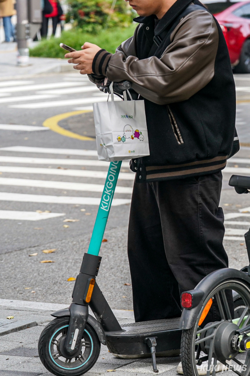 31일 유동인구가 많은 서울 마포구 홍대입구역 일원에서는 전동 킥보드를 탄 시민들이 보도와 횡단보도를 빠르게 질주하는 위험한 장면이 잇따라 목격됐다. 이날 오후 1시쯤 기자가 합정역에서 홍대입구역까지 이동하는 30여분간 3명의 전동 킥보드 탑승자가 보행자 사이를 가로지르며 운행하는 모습이 확인됐다.