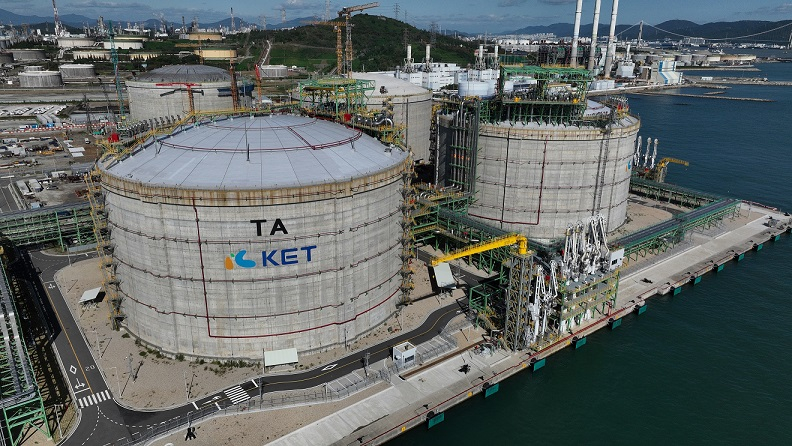 KET는 이미 준공된 LNG 저장탱크 2기와 추가 건설 중인 1기를 포함해 총 64만5000㎘의 LNG를 저장할 수 있으며, 하역·저장·기화·송출 설비를 모두 갖췄다. 특히, 바닷물을 활용한 ‘해수식 기화 시스템’으로, 시간당 1만톤(t)의 바닷물을 영하 162도의 LNG에 분사해 안정적으로 기체화한다.