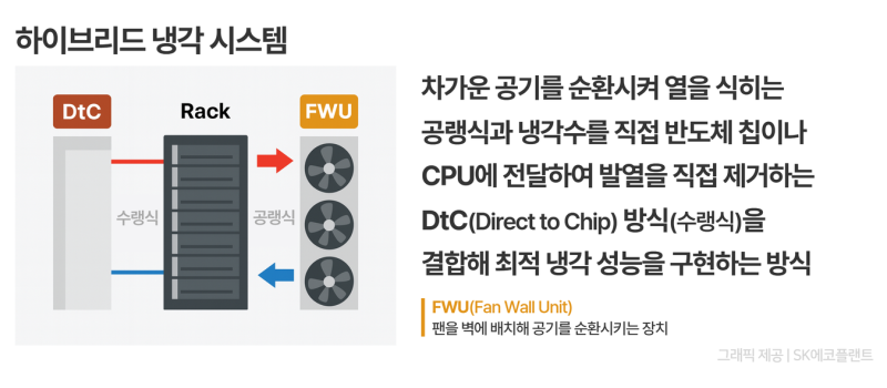 데이터센터 내부의 온도는 0.1도의 편차도 허용되지 않는다. 이를 위해 SK에코플랜트는 반도체 공장(FAB) 시공 노하우를 응용해 공랭식(차가운 공기 순환)과 수랭식(냉각수를 칩에 직접 전달)을 결합한 ‘하이브리드 냉각 시스템’을 적용했다.