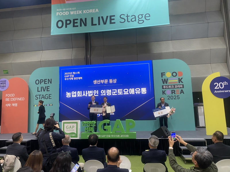 의령군 토요애유통㈜(대표 오재덕)이 농림축산식품부가 주최하고 국립농산물품질관리원이 주관한 ‘2025년 제11회 GAP(농산물우수관리) 인증 우수사례 경진대회’에서 생산부문 동상을 수상했다.