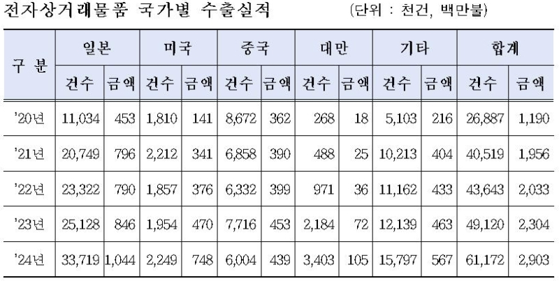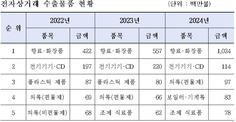 공개된 품목 내역은 화장품, 음반, 의류, 전자기기, 식품 등이 주요 수출품목군으로 자리잡아 K-뷰티, K-콘텐츠, K-패션 등 한류 소비재의 해외 인기가 높음을 보인다.