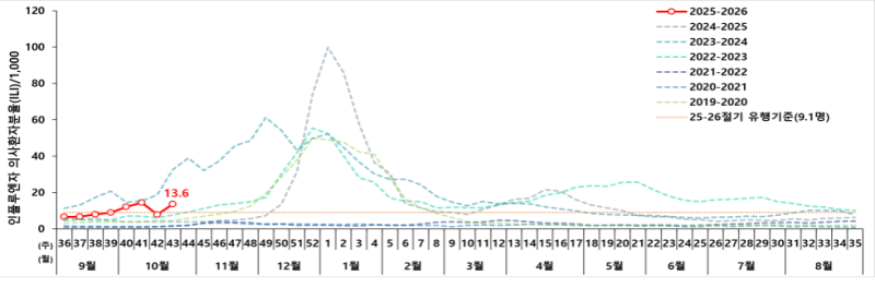 질병관리청에 따르면 2025년 43주차(10월19~25일) 기준 외래환자 1000명당 인플루엔자 의사환자 수는 13.6명으로 전주보다 증가했다. 지난해 같은 기간(3.9명)과 비교하면 3배 이상 높은 수치다. 특히 7~12세 31.6명, 1~6세 25.8명으로 소아·청소년층에서 발생률이 가장 높았다.