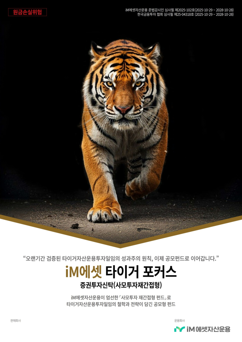 한편, iM에셋 타이거포커스 펀드는 사모펀드 기반 포트폴리오로 구성된 1등급(매우 높은 위험) 투자상품으로, 공모·사모를 아우르는 통합 운용체계를 바탕으로 개인투자자에게 차별화된 절대수익형 투자 기회를 제공한다.