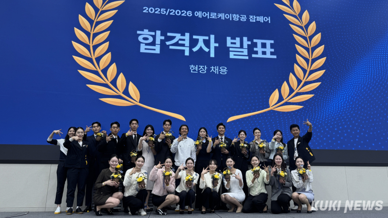 짧은 정적과 이어지는 박수. 누군가는 손을 모아 기도하고, 누군가는 벅차는 마음을 숨기지 못해 손으로 얼굴을 가리며 무대로 향했다. 경품 추첨인가 싶지만, 무대 위에서 불리고 있는 건 숫자가 아니었다. 에어로케이 최종 합격자의 이름이었다. 하루 만에 면접과 합격 통보가 이뤄지는 첫 국내 항공사의 ‘현장 채용’ 장면이다.