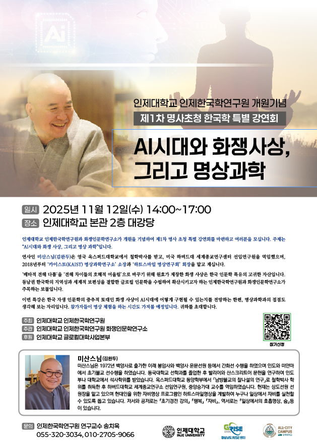 이달 12일에는 인제대 본관 2층 대강당에서 KAIST 명상과학연구소장인 미산 스님(김완두)을 초청해 ‘AI시대와 화쟁사상, 명상과학’을 주제로 강연을 한다.
