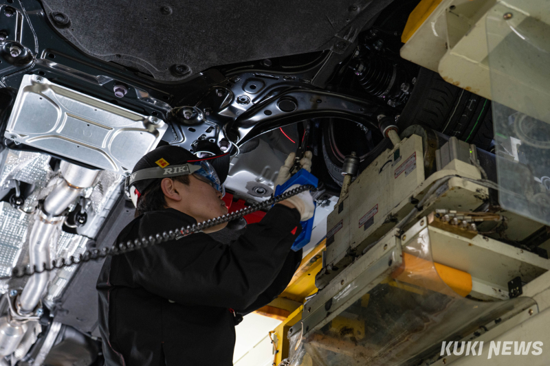조립 공정에서는 로봇팔이 차량 하부의 부품이 들어갈 구멍을 스캔하고, 약 1만가지 부품 조합 중 최적의 조합을 자동으로 선택한다. 0.1㎜ 단위까지 오차를 감지하는 방식이다. 하지만 최종 판단은 기계가 아니라 사람이 내린다. 작업자는 망치로 철판을 두드리는 ‘타종 검사’를 통해 금속의 울림을 직접 듣는다. 맑은 소리가 나야 합격이다.