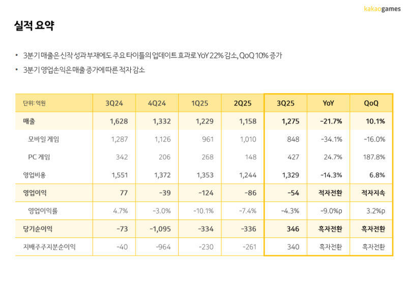 카카오게임즈는 올해 3분기 1275억원의 매출과 54억원의 영업손실이 잠정 집계됐다고 5일 밝혔다. 매출은 전년 동기 대비 21.7% 감소했고 영업이익은 적자로 전환됐다. 다만 같은 기간 순이익은 파생상품평가이익 등에 따른 영업외이익에 힘입어 346억원을 기록하며 흑자를 냈다.
