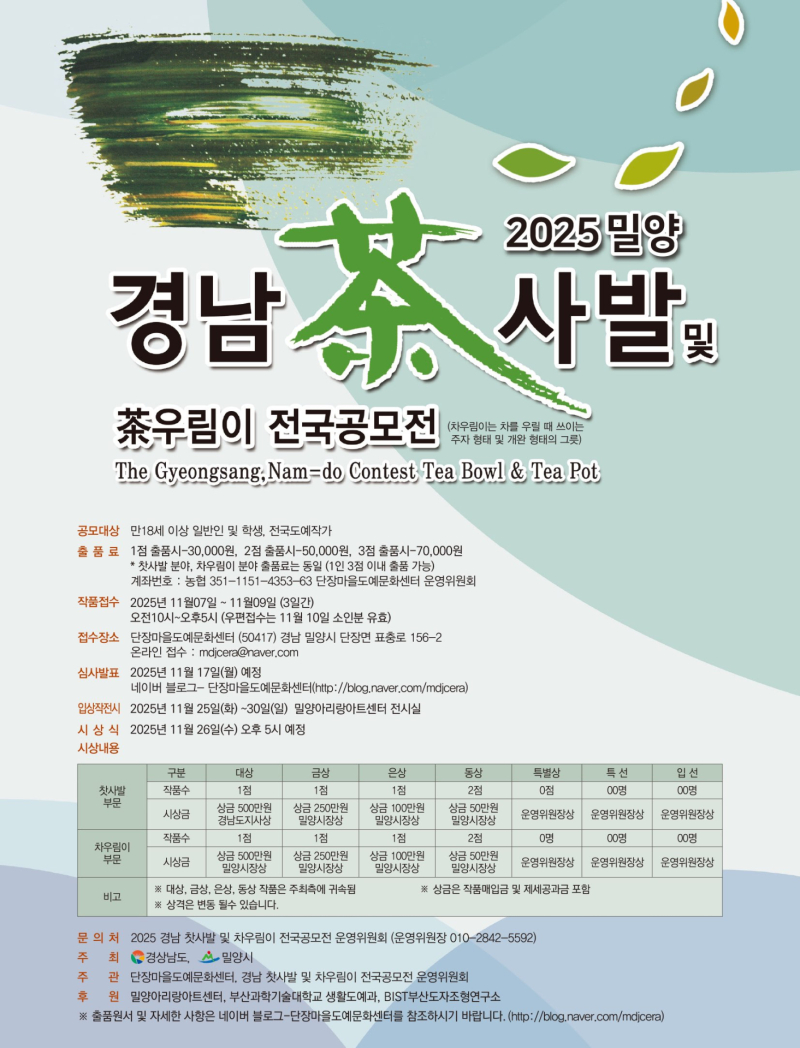 시 관계자는 “밀양은 오랜 도자기 역사와 전통을 자랑하는 도시”라며 “이번 공모전을 통해 지역 도예·찻사발 문화의 중요성을 되새기고 전국 도예가들과의 교류를 확대해 문화예술이 한 단계 더 성장하기를 기대한다”고 말했다.