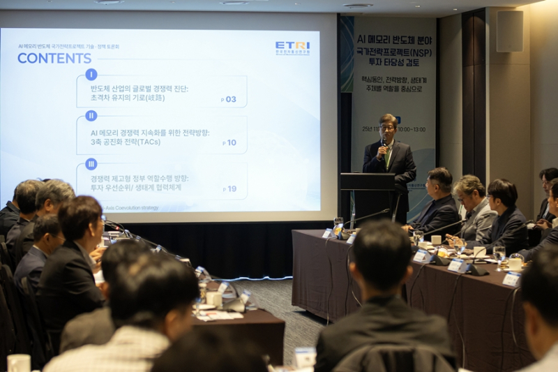 한성수 ETRI ICT전략연구소장은 “AI 메모리 반도체는 데이터를 저장하는 부품을 넘어 시스템 성능을 좌우하는 핵심”이라며 “민간 위주의 한계를 넘어서기 위해 정부의 전략적 R&D 지원과 산학연의 긴밀한 협력을 통해 공진화 모델을 구축해야 한다”고 말했다.