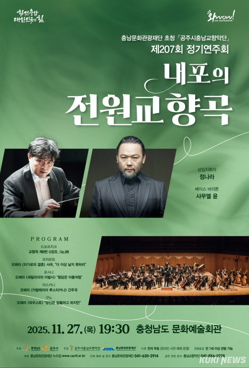 포스터. 충남문화관광재단은 오는 27일 오후 7시 30분, 충남문화예술회관에서 충남교향악단 제207회 정기연주회 <내포의 전원교향곡> 공연을 개최한다.