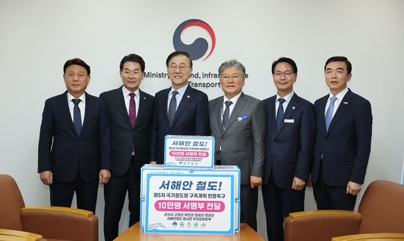 군산시와 고창군, 부안군은 전남 영광군, 함평군과 함께 5일 서울 국토발전전시관에서 김윤덕 국토교통부 장관을 만나 ‘서해안철도(새만금~목포) 건설사업’의 제5차 국가철도망 구축계획 반영을 공동으로 건의했다.
