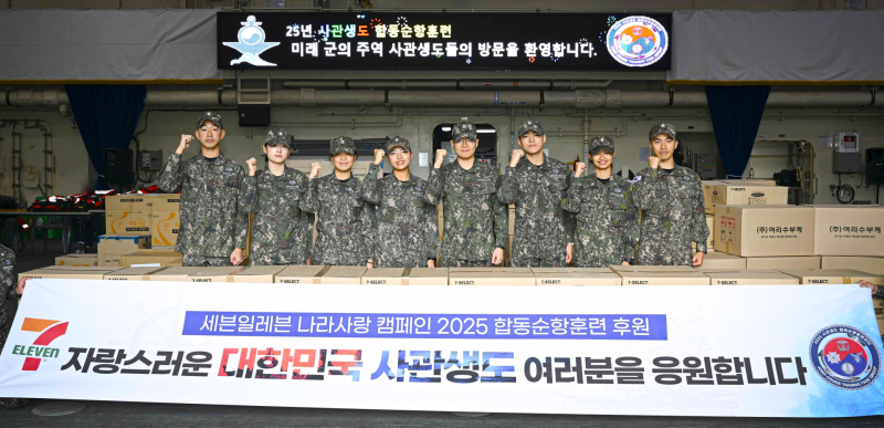 ‘대한민국 사관생도 합동순항훈련’은 육군사관학교, 해군사관학교, 공군사관학교, 국군간호사관학교 2학년 생도를 중심으로 1200여 명의 장병이 참여하는 훈련으로 최신예 군함을 타고 미국 괌을 방문해 국위선양과 군사 외교활동을 수행한다. 세븐일레븐은 이들의 성공적인 해외 훈련을 기원하고 장병들을 응원하는 뜻에서 1000만원 상당의 과자, 초콜릿 등 물품을 후원한다.
