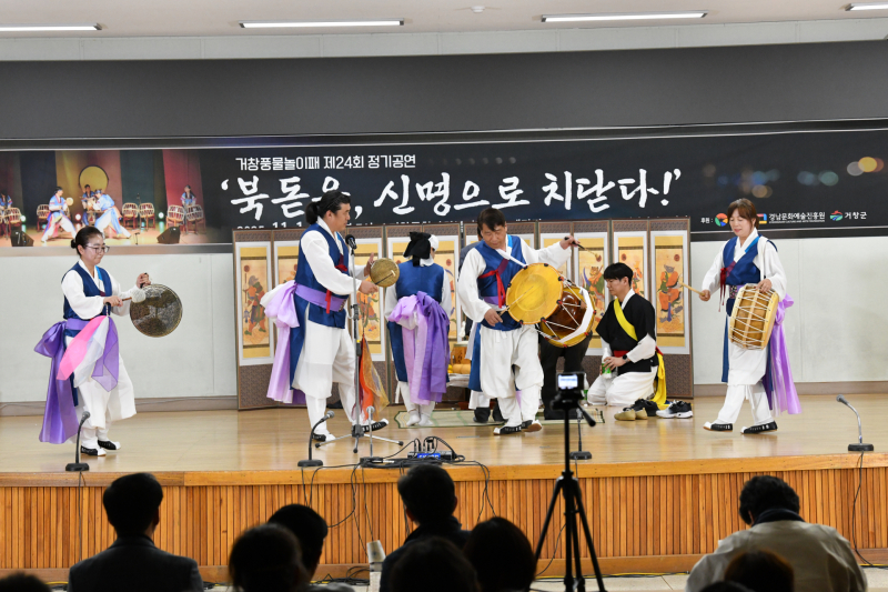 거창군은 지난 1일 거창군종합사회복지센터 대회의실에서 거창풍물놀이패(대표 하용현)의 제24회 정기공연 ‘북돋음, 신명으로 치닫다!’가 100여 명이 참석한 가운데 성황리에 개최됐다.