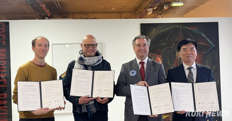 프랑스 국립아트센터 아쉬 뒤 세즈, 프락 피카르디, 프락 그랑라주 관계자와 조일교 충남도 문화체육관광국장(오른쪽)이 프랑스에서 현지시각 5일 업무협약을 체결했다. 충남도는 5일(현지시각) 프랑스 현지에서 프랑스 북부 지역의 주요 공공 현대미술기관 3곳과 업무 협약(MOU)을 체결했다.