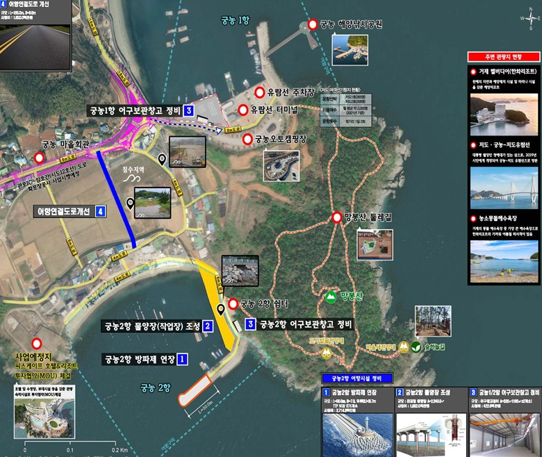 궁농항은 저도 유람선과 어선, 레저선이 같은 항내를 공유하면서 매년 안전사고와 민원이 빈번하게 발생한 지역이다. 거제시는 이번 사업을 통해 △외곽 방파제 확장 △정온수역 확보 △어항기능분리 △해양레저강화 등을 추진해 어민의 안전을 확보하고 ‘대통령 휴양지 저도’의 품격을 살려, 관광과 어업이 조화를 이루는 복합 항만으로 재탄생시킬 계획이다.