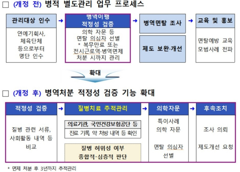 자료=병무청 제공 병무청은 병역법을 개정해 병적 별도관리자의 진료 이력 추적 근거를 마련하고, 지방병무청장이 필요시 의료기관의 장, 국민건강보험공단, 건강보험심사평가원의 장에게 질병명·진료 일자·약물 처방 내역 등을 요청할 수 있도록 의료법도 개정했다.