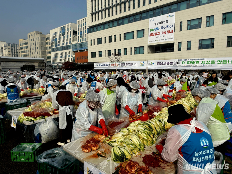 특히 이른 아침부터 충남세종 각지에서 자원해 참여한 봉사자들은 충남 관내에서 재배한 배추와 고춧가루 등으로 10톤(10,000kg)물량의 김장김치를 담궜으며, 만들어진 김치는 각 시군을 통해 어려운 이웃들에게 전달할 예정이다.