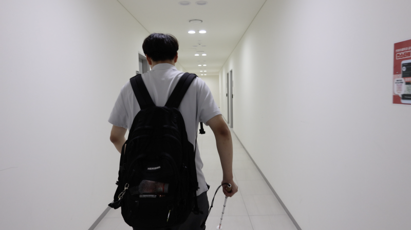 시각장애 대학생 송혁(24)씨가 학과 교학팀을 찾은 건 지난 9월25일. 건물 복도 바닥엔 깨끗한 흰색 타일뿐, 시각장애인의 이동을 돕는 점자블록은 없었다. 혼자서는 교학팀의 위치를 찾기 어려웠던 송혁씨는 지나가던 학우에게 도움을 요청해 7분 만에 목적지에 도착했다. “시각장애인인 제가 학교 공간을 찾아가는 건, 미로 찾기랑 똑같아요.” 송혁씨는 말했다.