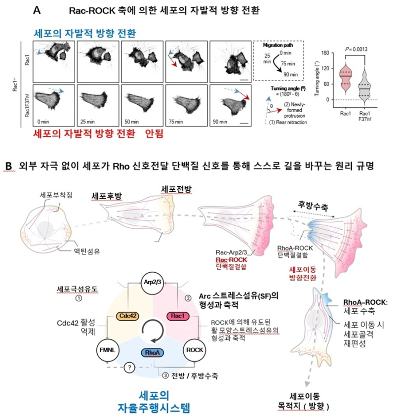 연구진은 이 가설을 검증하기 위해 Rac1 단백질의 37번째 아미노산을 바꾼 결과 Rac1이 ROCK 단백질과 결합하지 못했고, 세포는 방향을 바꾸지 못하고 직선으로만 이동했다.