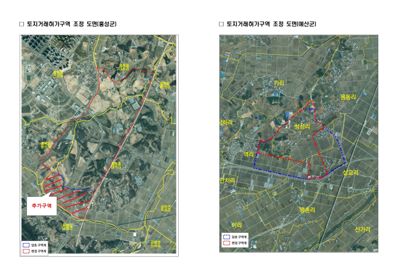 반면 예산군은 2023년 10월 23일 지정한 예산군 삽교읍 삽교리 일원 1177필지 166만 6000㎡ 중 일부(3개 리 412필지 67만 5000㎡)를 해제하고 삽교읍 용동리 7필지 1000㎡를 새롭게 포함했다.