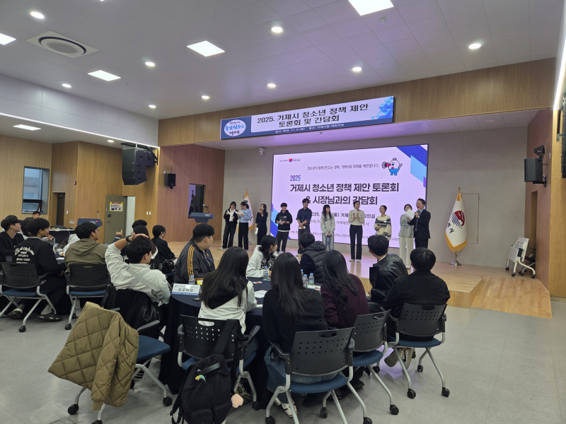 이번 행사는 청소년들이 사전에 정책 관련 교육을 받고, 모둠별 토론을 통해 정책제안서를 직접 작성한 뒤, 거제시장과의 간담회를 통해 발표하고 의견을 나누는 참여형 청소년 정책 프로그램으로 진행됐다.