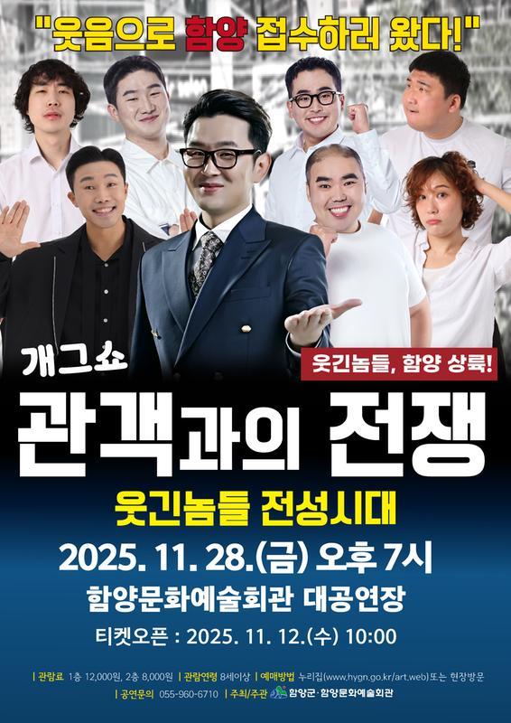 함양문화예술회관은 11월28일 오후 7시 대공연장에서 개그쇼 ‘관객과의 전쟁’ 공연을 진행한다.