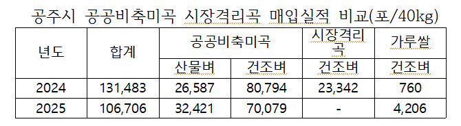 올해 공공비축미곡 매입량은 총 4268t으로, 이 가운데 산물벼 1297t과 건조벼 2971t이 포함되며, 유구 백교창고 등 정부양곡창고에서 수매가 진행된다.
