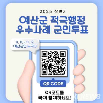 예산군은 적극행정 우수공무원 선발을 위해 11일부터 17일까지 온라인 군민투표를 실시한다고 밝혔다. 예산군은 2025년 상반기 적극행정 우수공무원 선발을 위해 11일부터 17일까지 7일간 온라인 군민투표를 실시한다고 밝혔다.