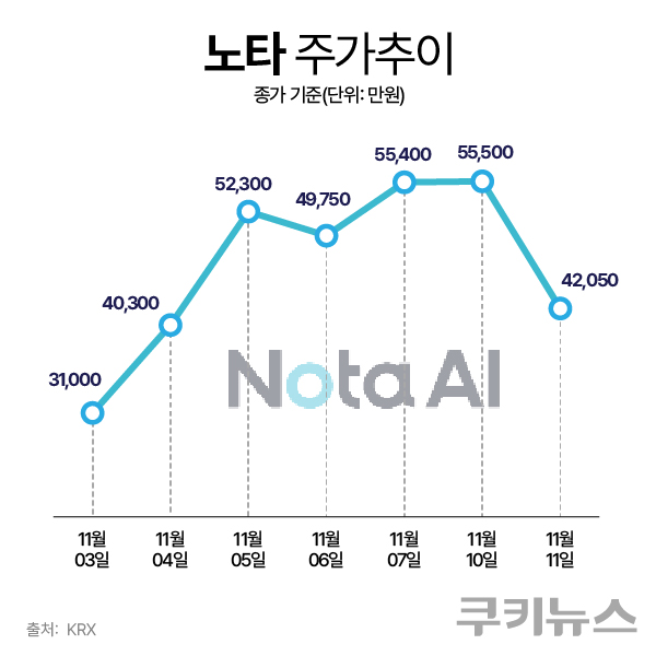 노타는 이튿날부터 다음날까지 이틀 연속 상한가로 거래를 마쳤다. 지난 6일에는 장중 한때 6만5300원까지 치솟았다. 상장 후 최고가 기준 시가총액은 1조4000억원에 달했다. 이는 공모가 기준 시가총액 1926억원 대비 7배에 달한다. 이후 주가는 5만원선에서 등락을 거듭하다가 이날 20% 이상 급락했다.