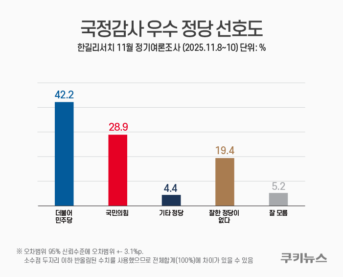 같은 대상에게 ‘국정감사 우수 정당 선호도’를 묻자 민주당이 42.2%로 국민의힘(28.9%)에 비해 13.3%포인트(p) 높게 나왔다. 이어 잘한 정당이 없다 19.4%, 잘모름 5.2%, 기타정당 4.4% 순이었다.